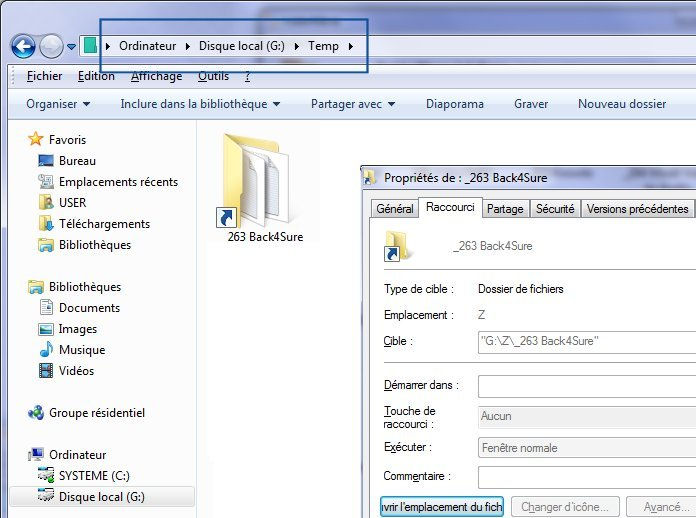 Soit à déplacer un dossier contenant des exécutables et d'autres fichiers, lequel dossier se trouve dans un dossier G:\Temp et possède sur le bureau un raccourci de commande d'exécutable :