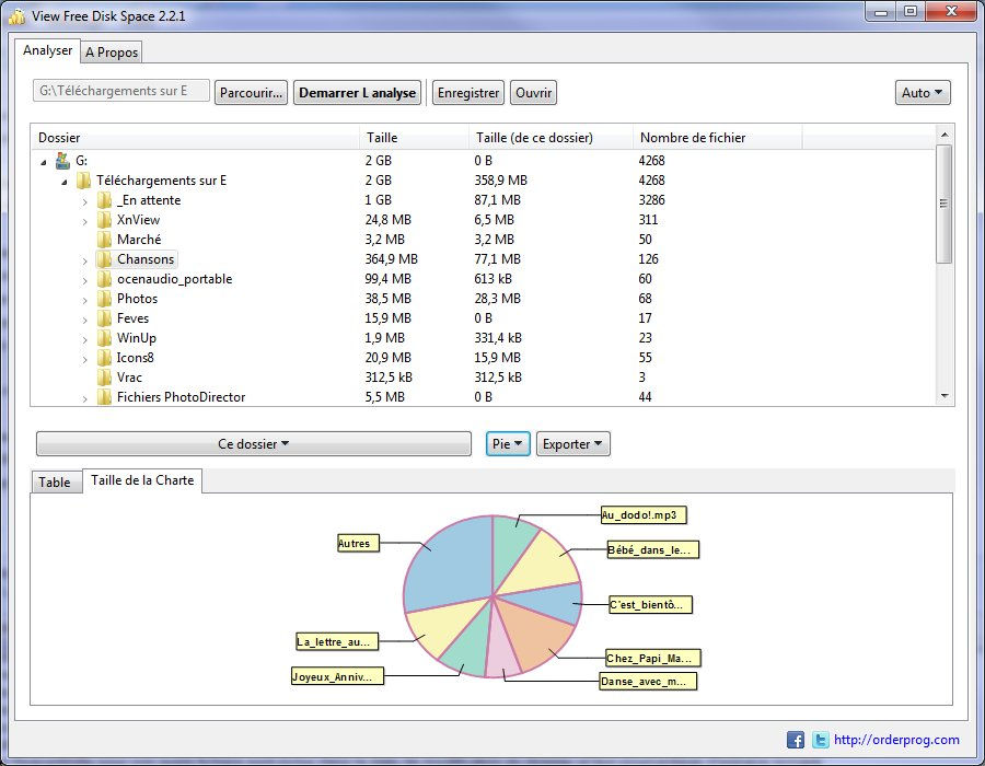 - Afficher l'espace disque disponible. Affiche les 100 premiers formats de fichier, en occupant le dossier sélectionné.